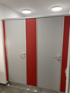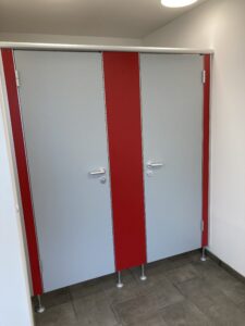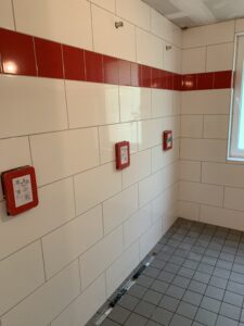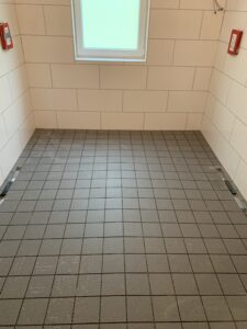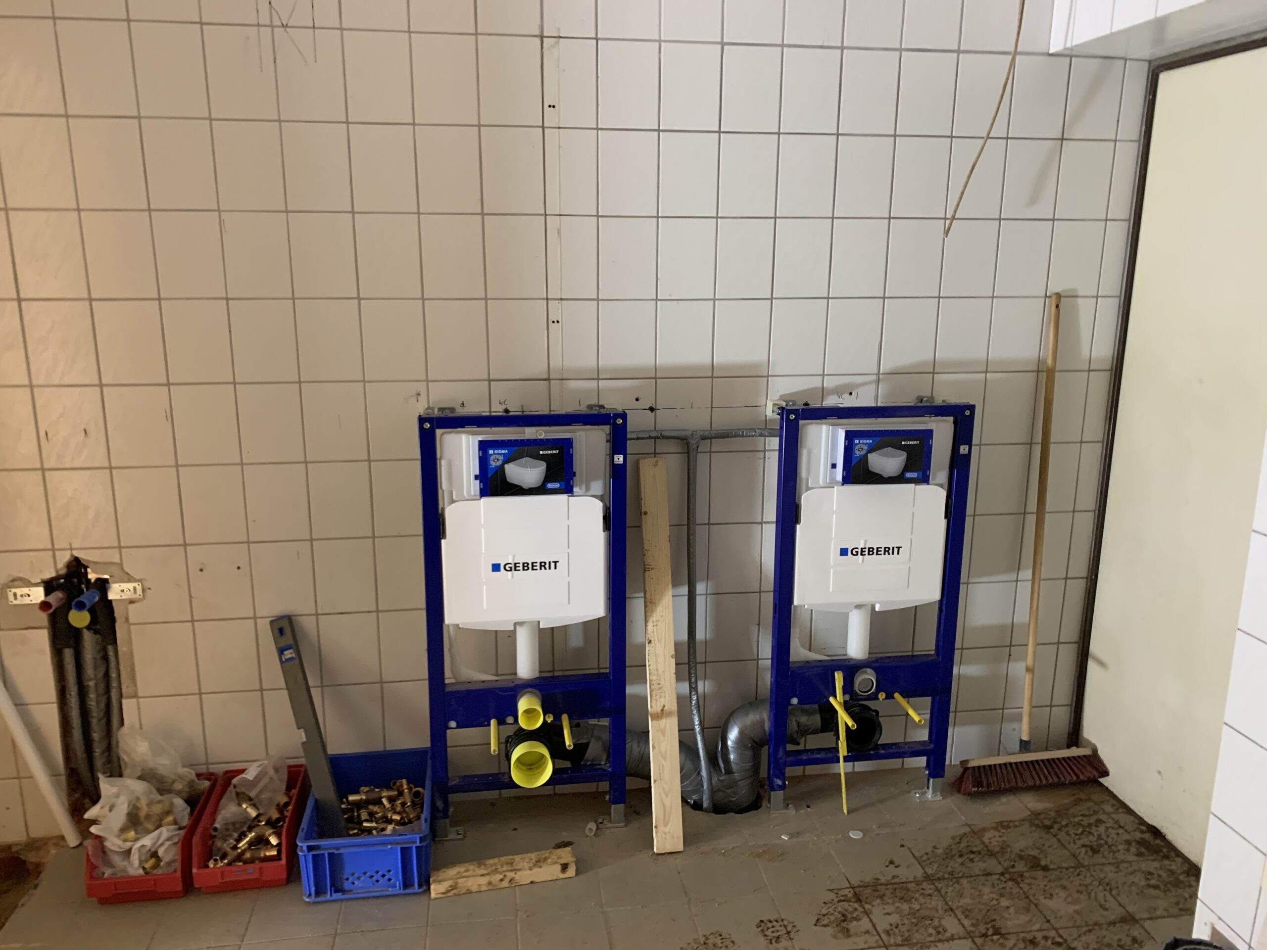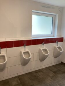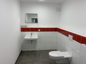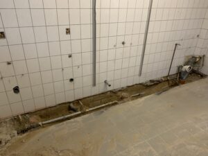Für die Verlegung der neuen Grundleitung im Bestandsteil wurden die sanitären Einrichtungen zurückgebaut und die vorhandene Sohle geschlitzt und rausgestemmt. Diese Arbeiten fanden in Eigenleistungen statt.