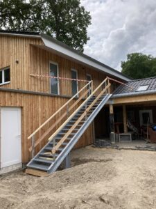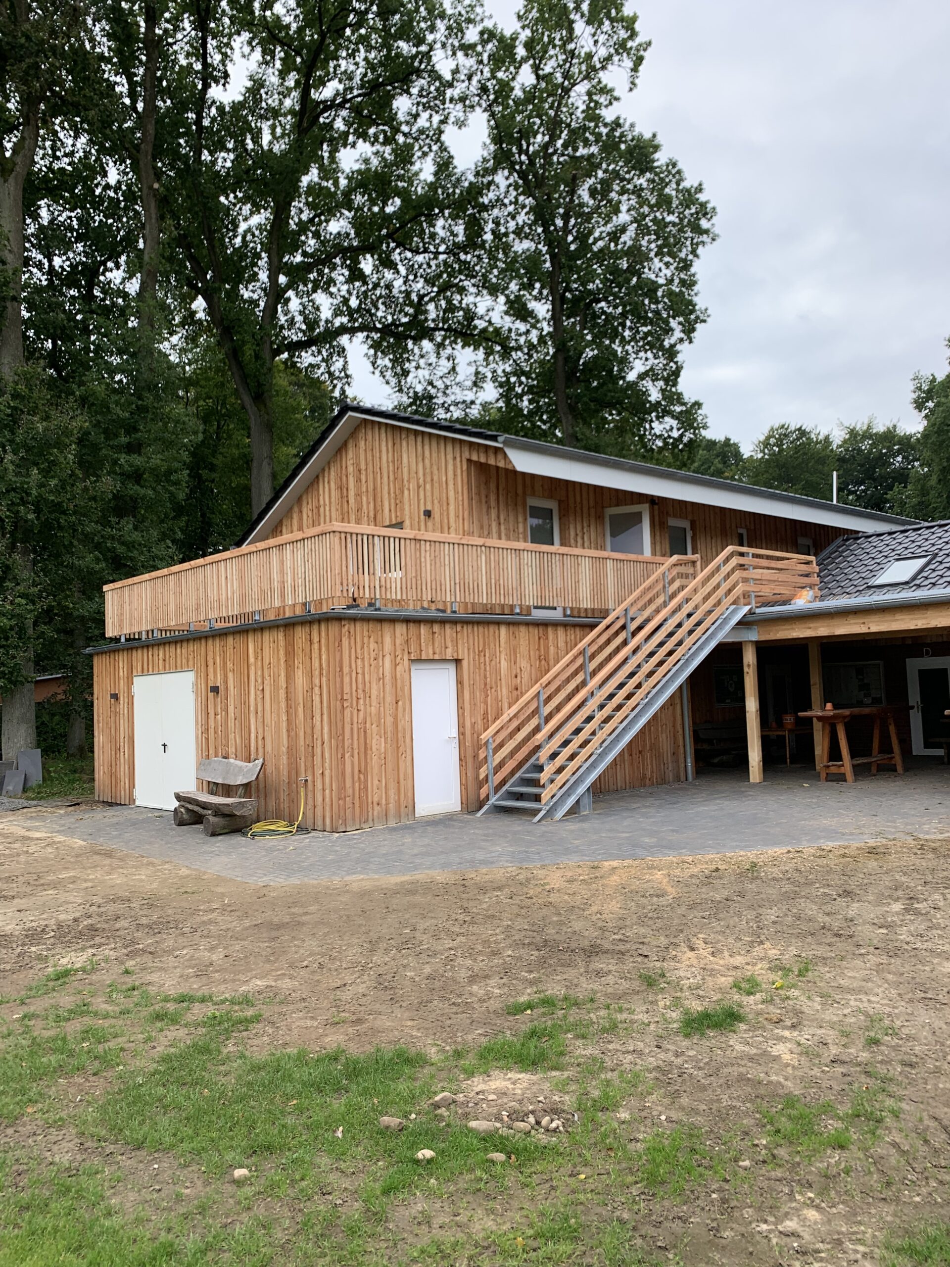 Mit der Fertigstellung des Geländers am Balkon, dem Aufbau der Außentreppe und dem Abschluss der Pflasterarbeiten ist die Aussenansicht nun im Endzustand.