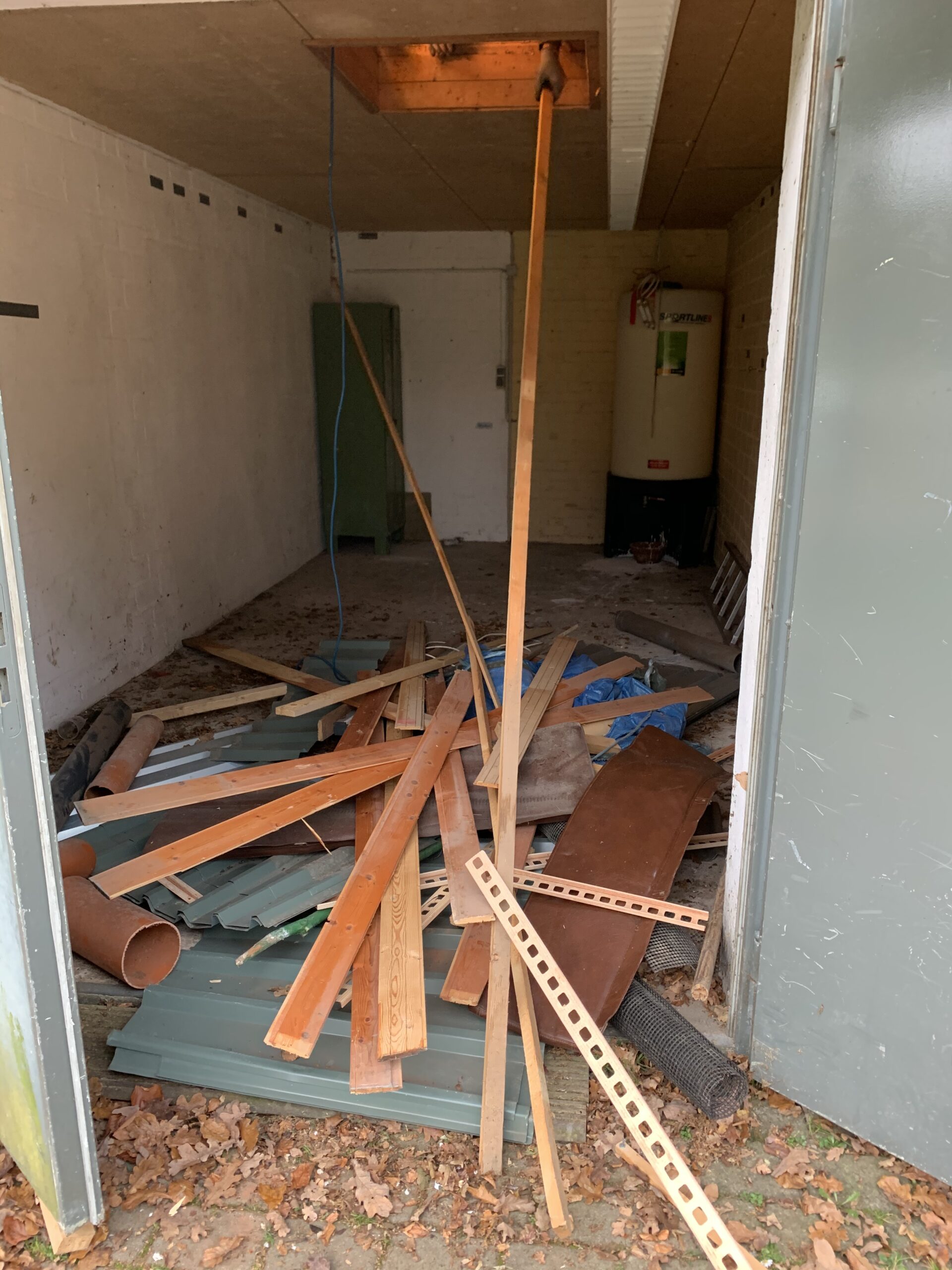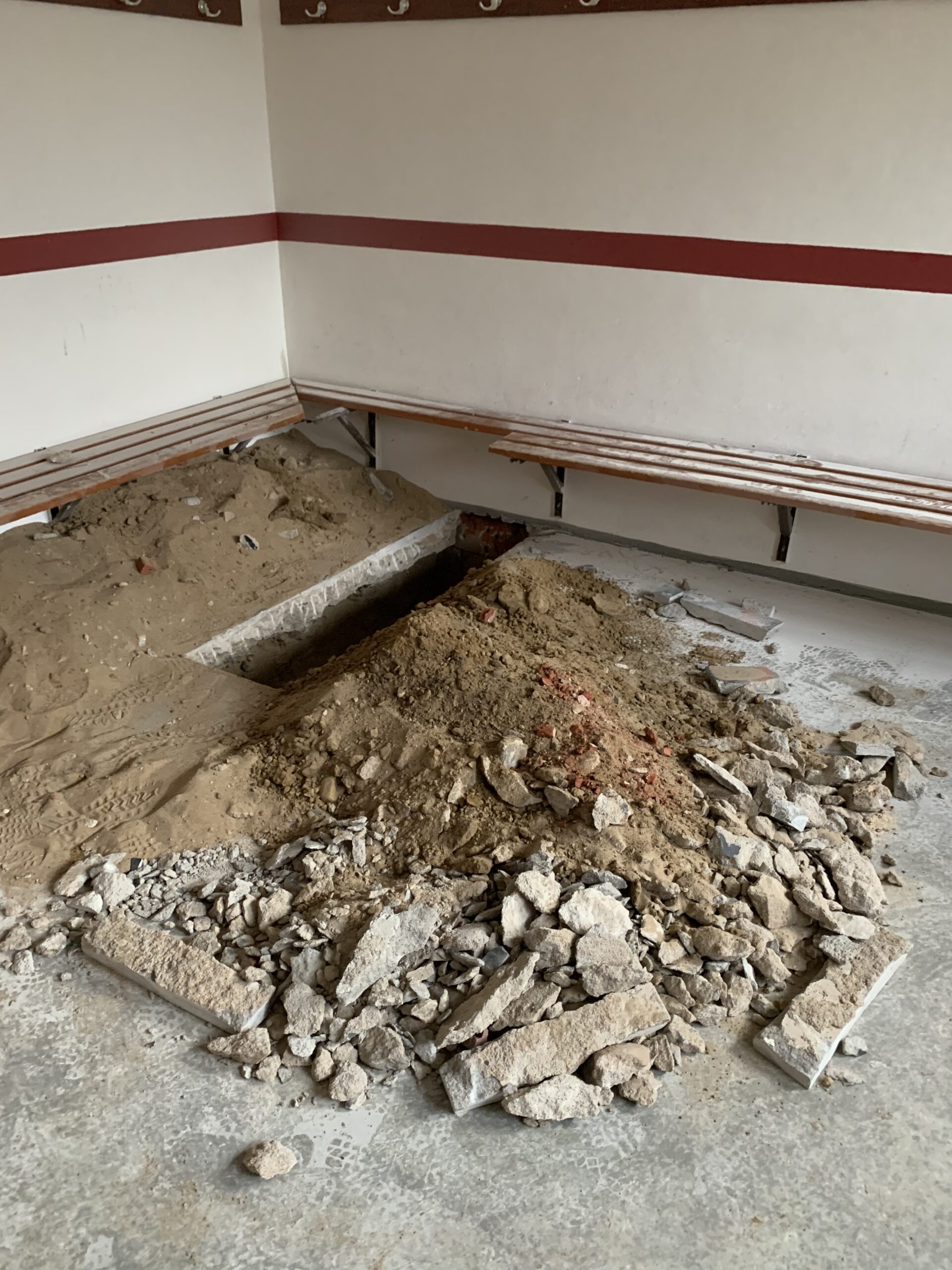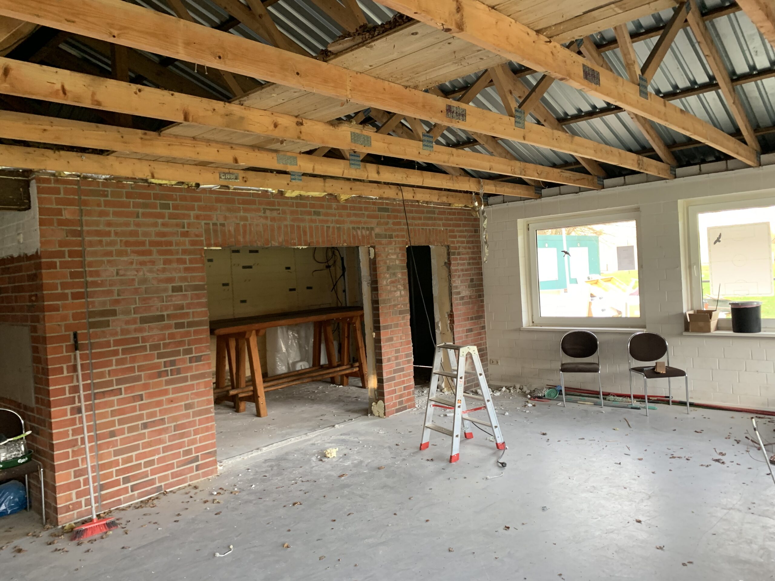 Die Wände zwischen dem Gruppenraum, dem Geräteraum und der Herrendusche wurden in Eigenleistung abgebrochen.