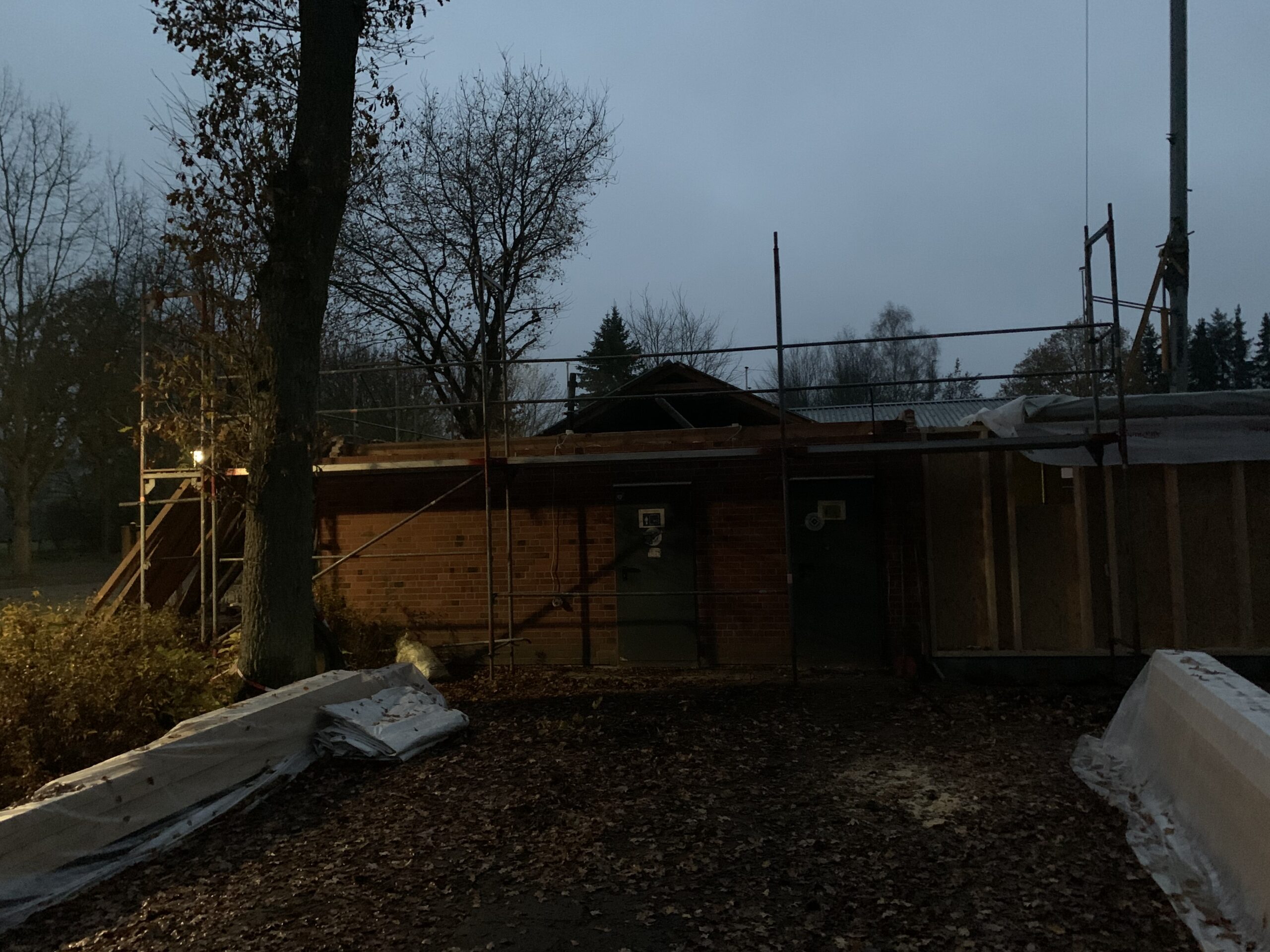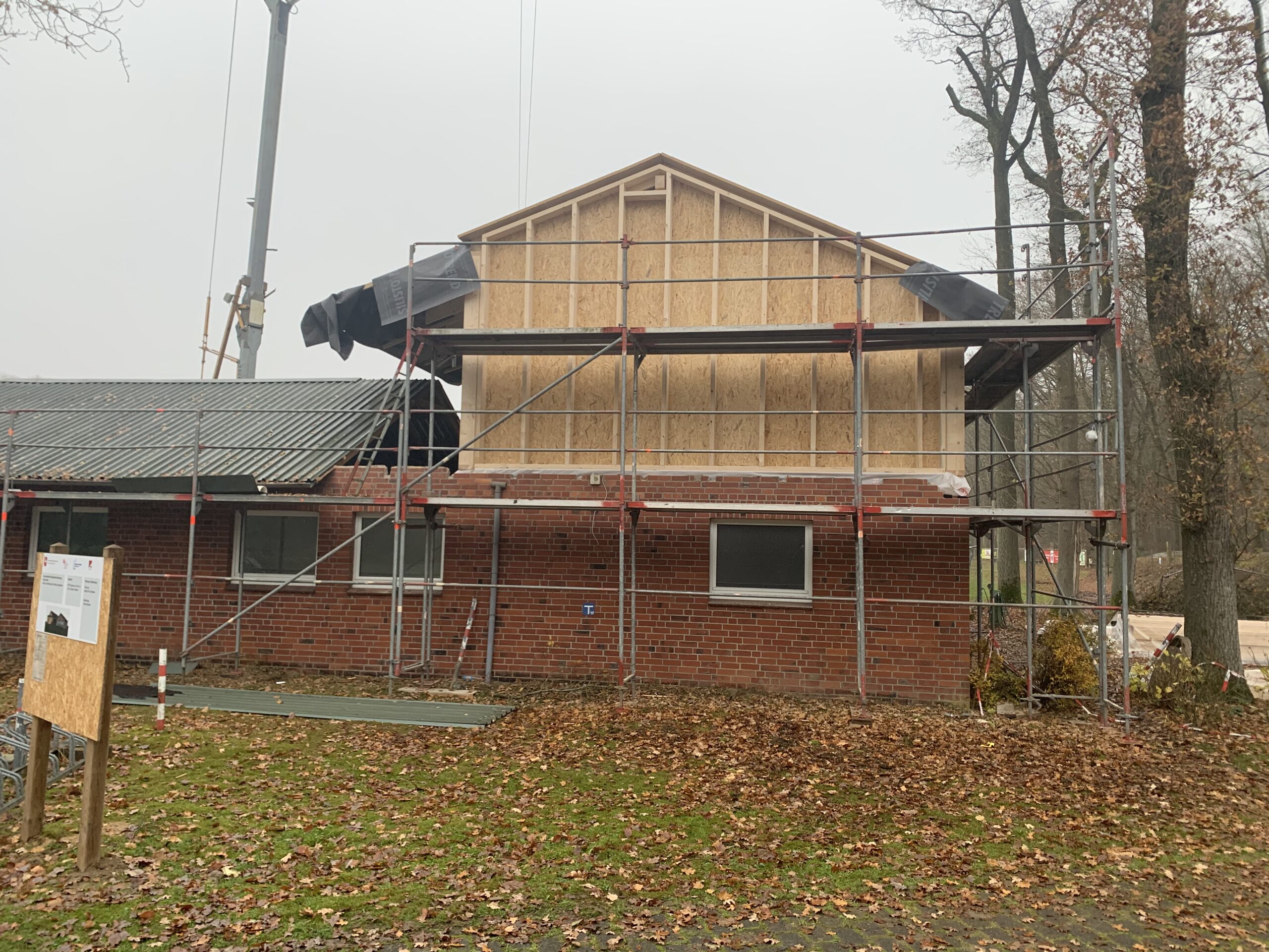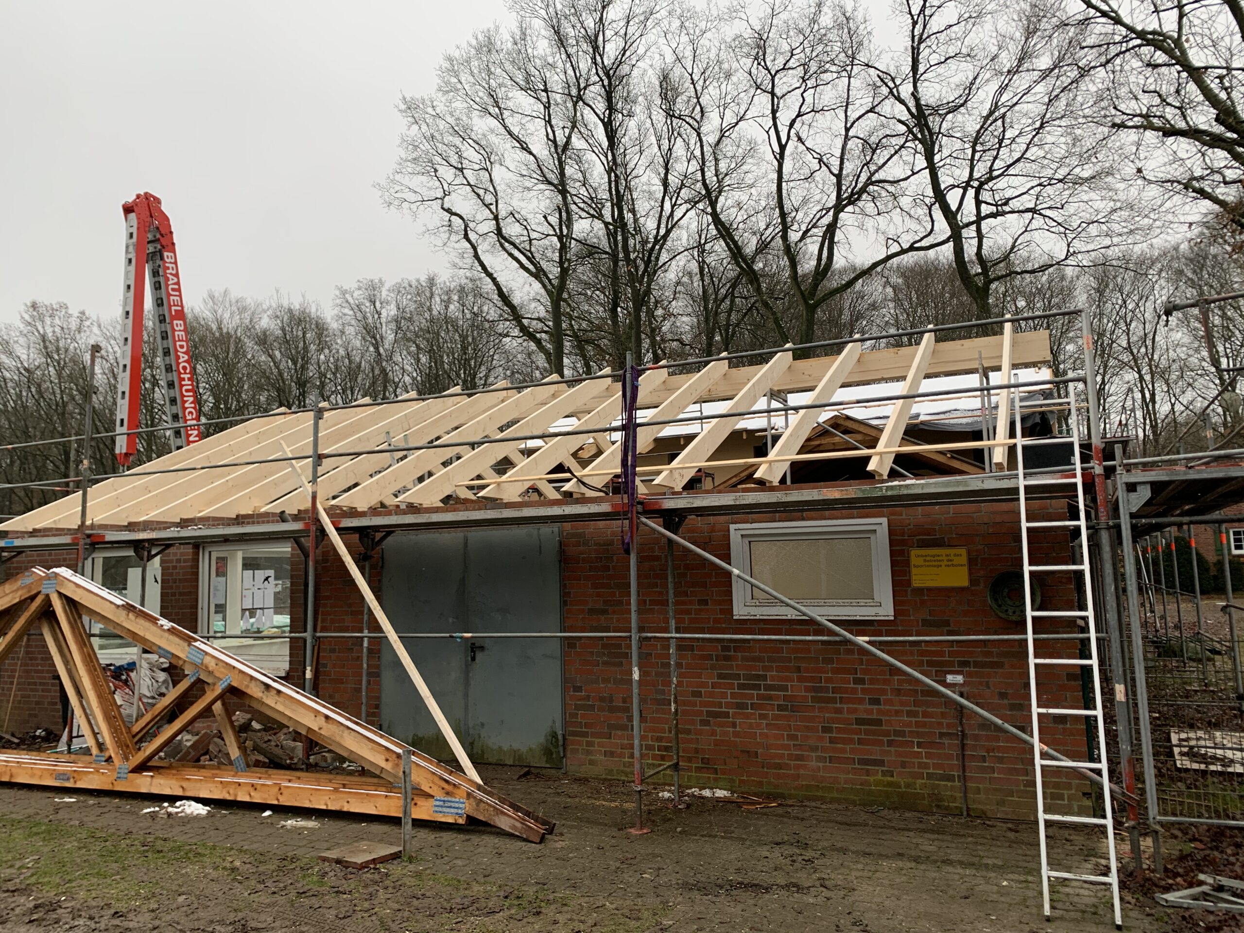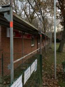 Für die Errichtung des Obergeschosses musste bereits jetzt der vorhandene Dachstuhl über den Toiletten, dem Schiedsrichterraum und dem Heizraum zurückgebaut werden.