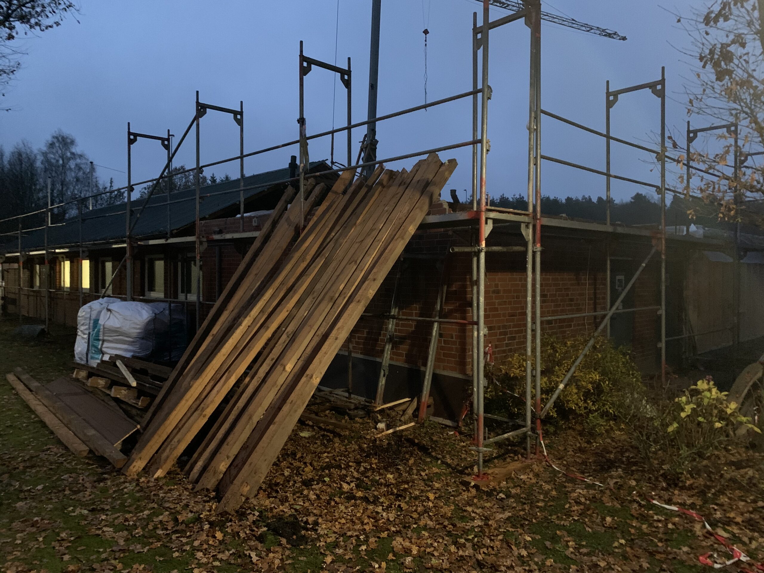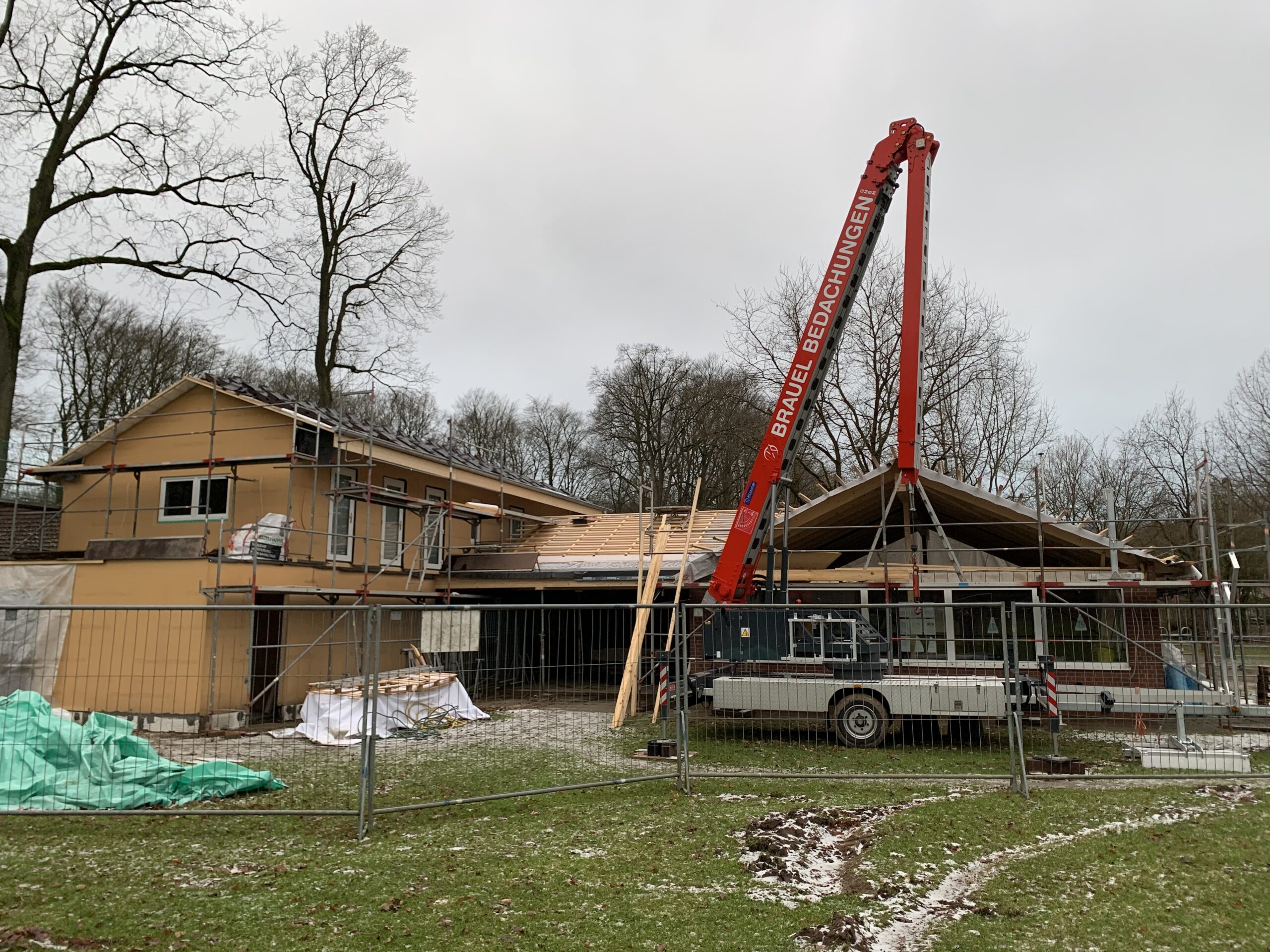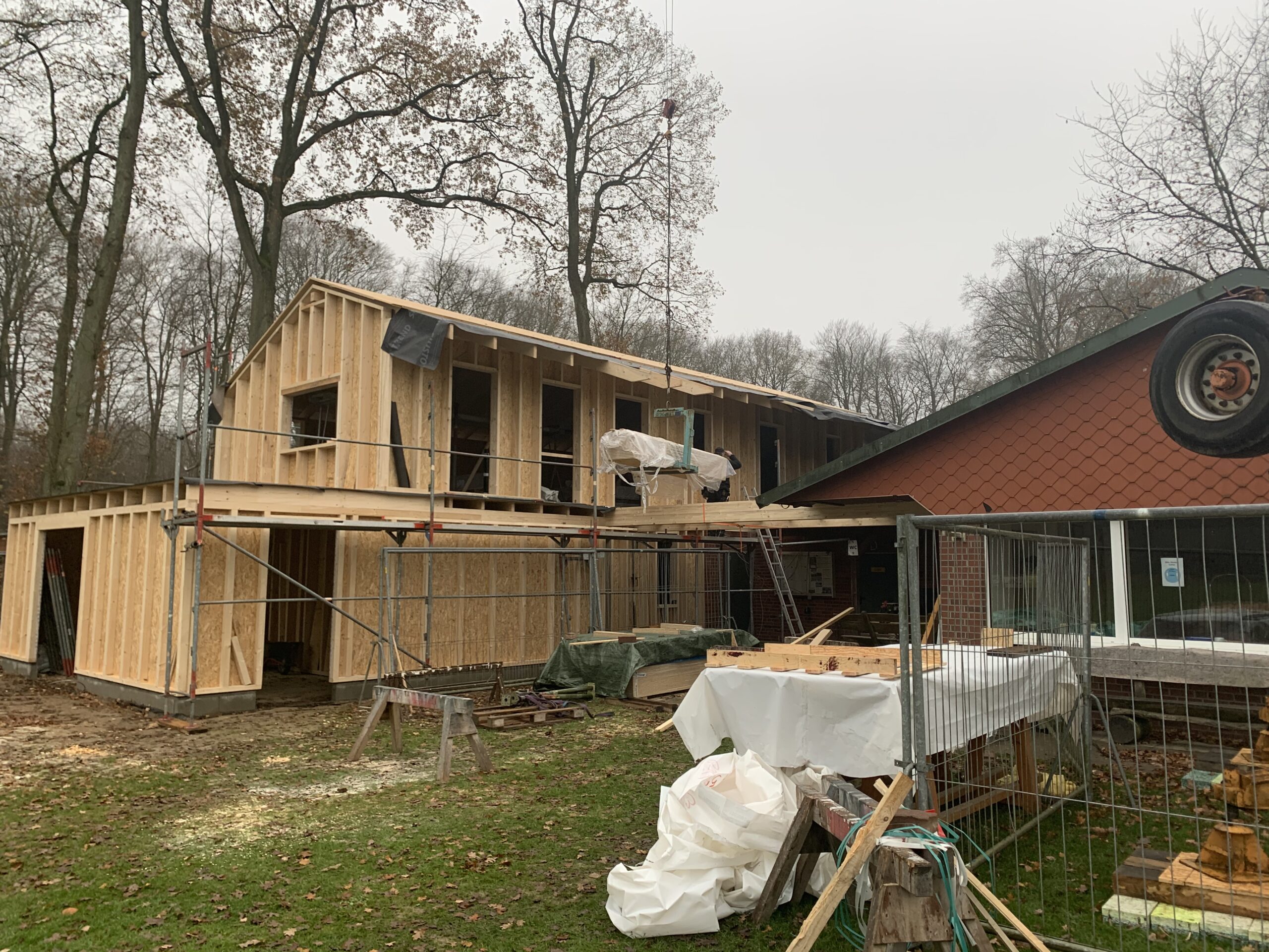 Für die Errichtung des Obergeschosses musste bereits jetzt der vorhandene Dachstuhl über den Toiletten, dem Schiedsrichterraum und dem Heizraum zurückgebaut werden.