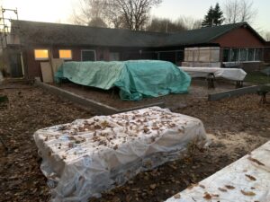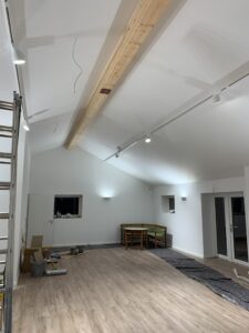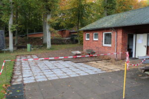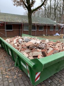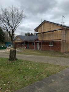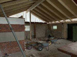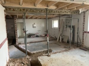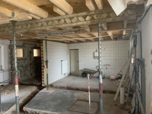 Für die Verlegung der neuen Grundleitung im Bestandsteil wurden die sanitären Einrichtungen zurückgebaut und die vorhandene Sohle geschlitzt und rausgestemmt. Ebenso wurde der Dachboden ausgeräumt. Diese Arbeiten fanden in Eigenleistungen statt.